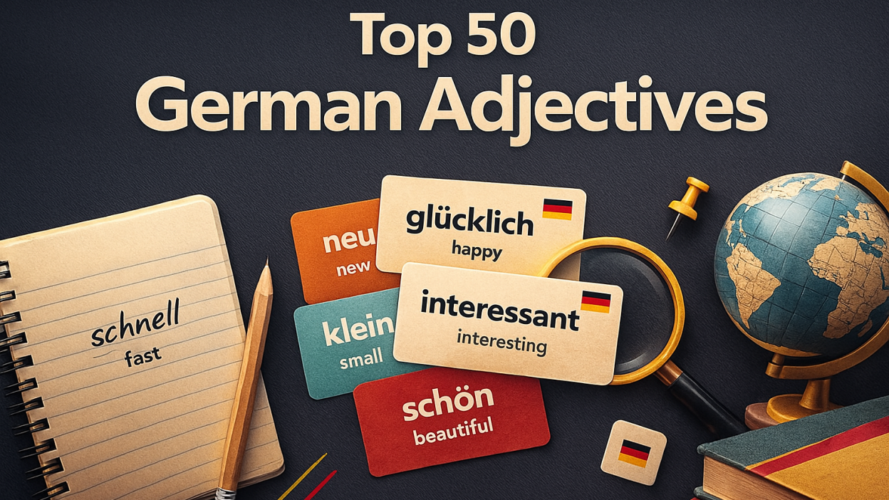 Learn the 50 most useful German adjectives with easy example sentences and English translations. A simple, beginner-friendly guide to help you describe people, places, and everyday life in German with confidence.